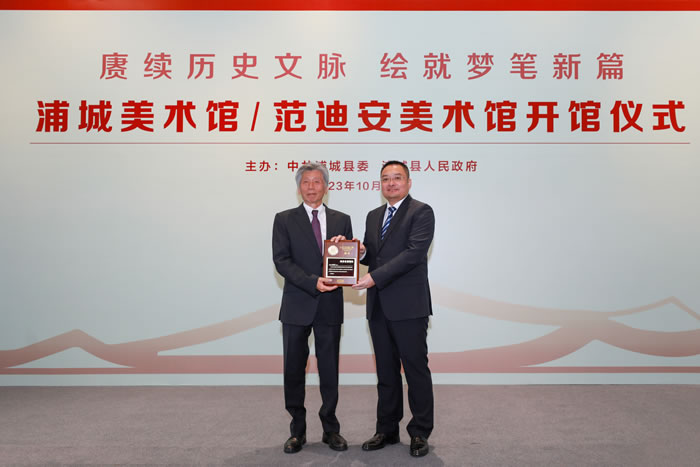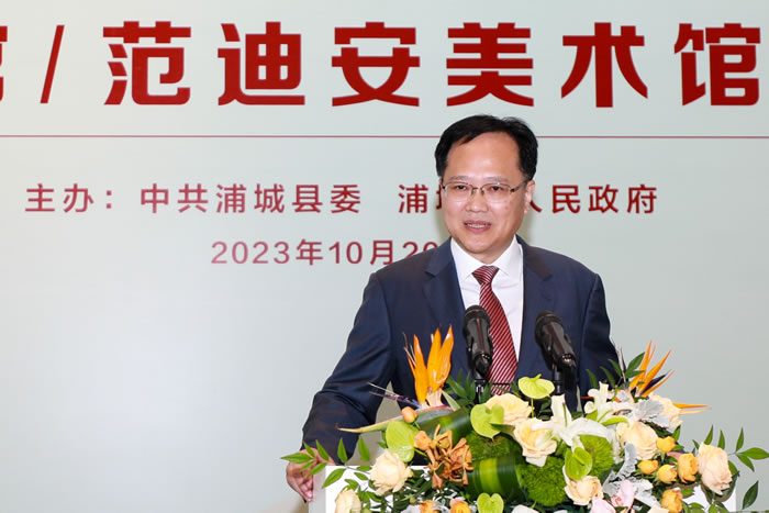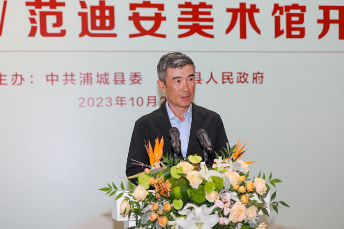 中国美术家协会主席范迪安对各位领导、前辈及同仁的关心、鼓励和肯定表示衷心的感谢。他说:“浦城美术馆/范迪安美术馆作为一座现代型态的基层美术馆,是新时代新征程,学习贯彻习近平文化思想,坚定文化自信,建设中华民族现代文明的重要实践。”范迪安先生在爱人叶辉玲和孩子们的支持下,将一批作品捐赠给家乡,是他艺术作品最好的归宿。“藏品是一座美术馆的立馆之基,各位艺术同仁的慷慨捐赠,为美术馆的发展奠定了重要的学术基础。”他表示,美术馆的开馆只是拉开了为公众服务的帷幕,接下来,将继续立足浦城,服务南平和福建,面向全国和世界,努力打造新时代人民群众欣赏美术佳作、提升文化素养的艺术殿堂,为推动中国美术事业的发展,为铸就社会主义文化新辉煌作出积极贡献。