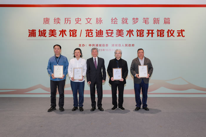 随后,举行了浦城美术馆/范迪安美术馆荣誉馆长聘任仪式,浦城县长李江平为范迪安颁发浦城美术馆/范迪安美术馆荣誉馆长暨学术委员会主任聘书。范迪安主席为中国美术家协会兼职副主席徐里、中央美术学院艺术管理与教育学院院长余丁、福建省文联书记处书记、福建美术家协会主席王来文、南平市美术家协会主席、武夷学院美术学院原院长陈铎、福建省美协副主席、泉州画院院长郭宁颁发浦城美术馆/范迪安美术馆学术委员会副主任聘书。