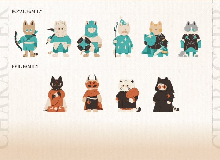这些角色及原型包括Meowlin喵林(拿法杖的,角原型梅林)、 Meowgana喵⽢娜(拿⽔晶球的⿊猫,角⾊原型莫⽢娜)、Meowdred喵得瑞德(兔狲形象的坏坏猫)Purcival噗⻄⽡尔(⾓⾊原型珀⻄⽡⾥)。