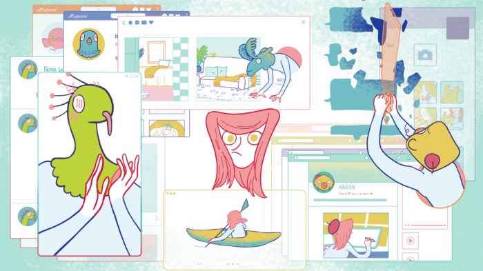 这些原本带有生活温度和情感逻辑的人物形象,当它们纷纷跳上屏幕,把屏幕上的头像挤下去时,被挤掉的动物头像就会在地上滚来滚去,大喊着“我要回去!”
