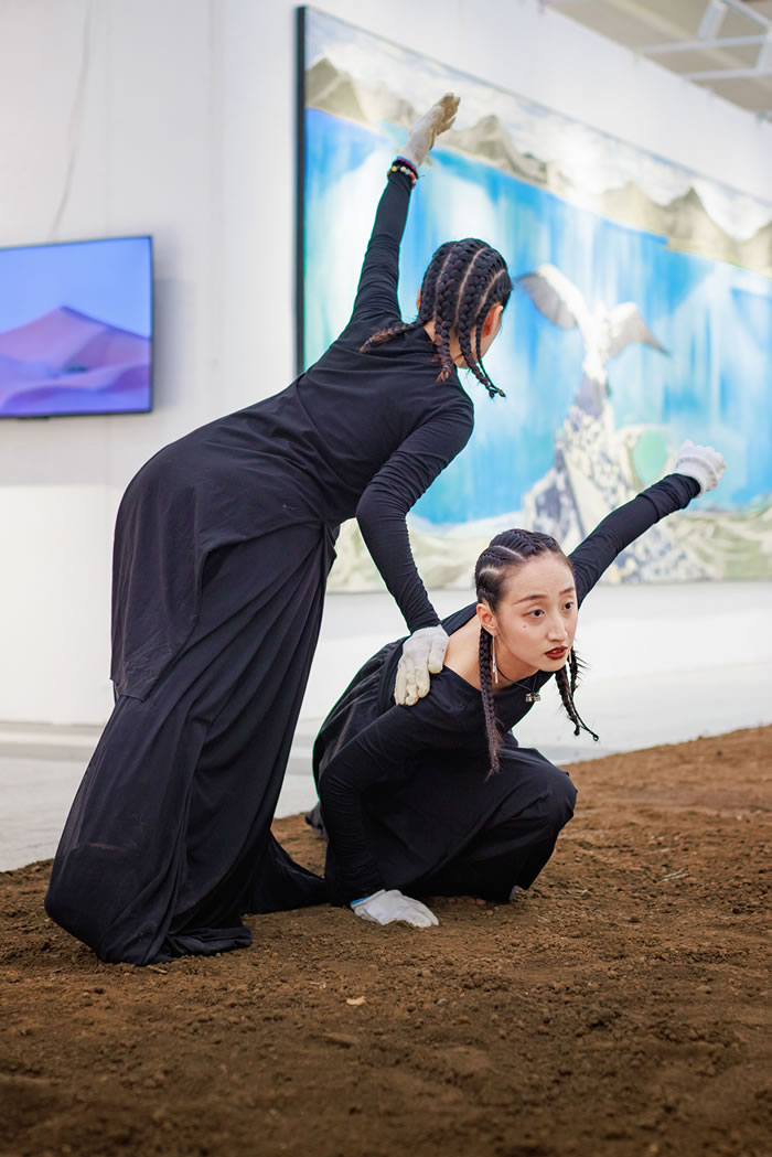 为呈现当代艺术的多元面貌,今年大艺博更在开幕日特设身体剧场,邀请青年艺术家张淼,带来其荣获明天当代雕塑奖的代表作《粮食的容器》,以大地雕塑与女性肢体的舞动表达对大地母亲的礼赞。