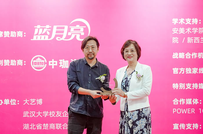 艺博组委会特邀湖北美术学院副院长张炼作为颁奖嘉宾,向蓝月亮颁发“十年相伴·艺路同行”特别荣誉纪念奖