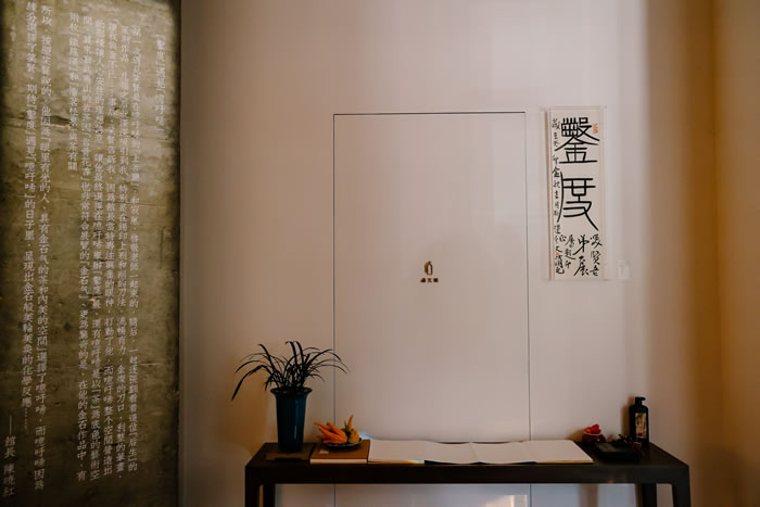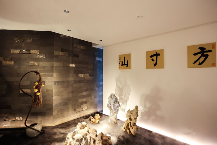 曲水墙面上挂着艺术家的书法作品“方寸山”
