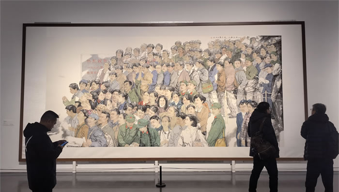 第一,人物造型的“王家样”图式化和个性化。颖生在人物造型尤其是面部造型上已经形成他自己的王家图式,可贵的是他在图式化的刻画中又使每个形象鲜活各异,范式化而不雷同化。这种特色在他的巨幅新作《恢复高考》中体现得淋漓尽致,百余个年纪相仿的青年考生,这种大题材大场面多人物,既使对于长于写实的油画家,也是极大的考验 ,但颖生完成得十分精彩:一百二十多个年龄相仿的青年考生,统统长了一幅“王家样式”的脸,却又性格鲜明有别、刻画手法各异、人物众多绝不重复雷同!这种写实功力和统一范式的能力,真的令人叹为观止!这些特点在颖生其他人物众多的大场面作品中也多有展示。