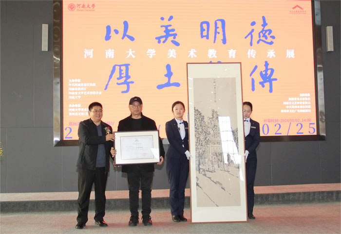 王颖生教授向河南大学捐赠作品《少林祖庭》,河南大学美术学院党委书记杨江涛接受捐赠