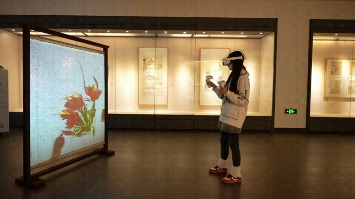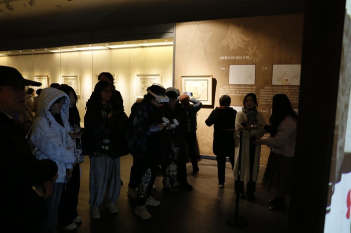策展团队结合艺术与科技,在现场打造“没骨VR体验区”,观众通过研读恽南田代表作,跟随贾广健没骨花卉的示范影像,进行没骨笔触训练,亲身完成一幅专属没骨画,使整个观展过程更加生动有趣。