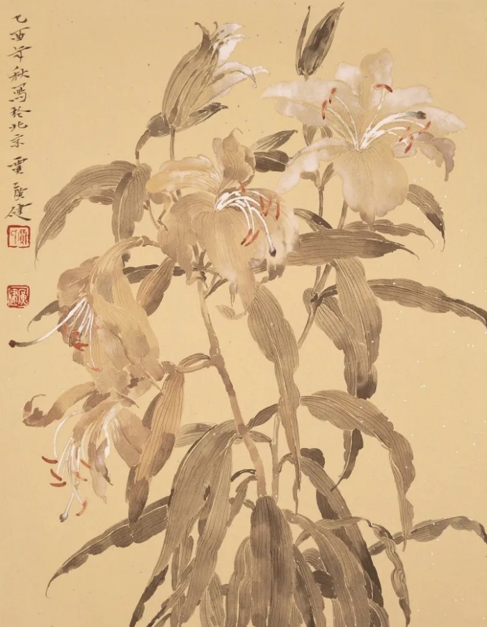 在中国国家画院的十多年时间里,贾广健教授徜徉于艺术殿堂之中,系统研读中国花鸟画历代名家的艺术珍宝。也就是在那段时间,贾广健深挖中国画传统技法几近失传的“没骨画法”。他认真研习清代画家恽寿平的没骨画法之精髓,从生活中累积经验、采撷素材,从传承中汲取养分、寻找突破,将没骨画法重新带回到当代美术中,经过多年钻研,他先后创造出没骨画《粉淡香轻》《鸣秋》《盛世繁华》等作品,开创了当代没骨“骨秀内含、雅静舒逸”的国画新风,并将创作技法和心得整理传授,培养了一批优秀的青年书画家。