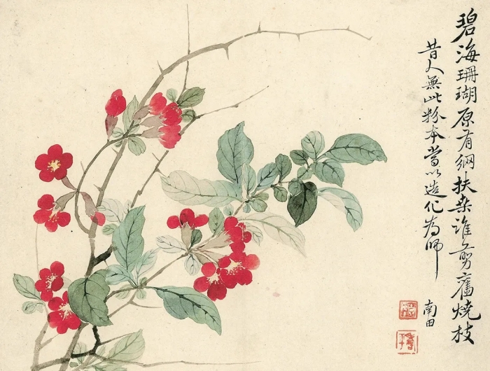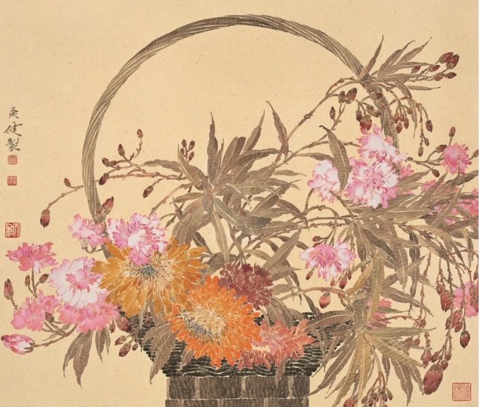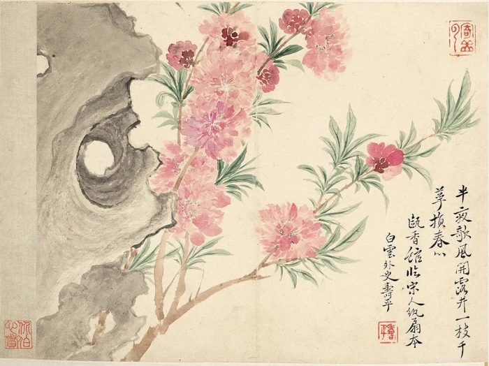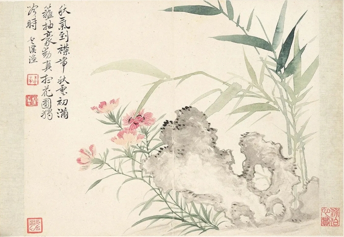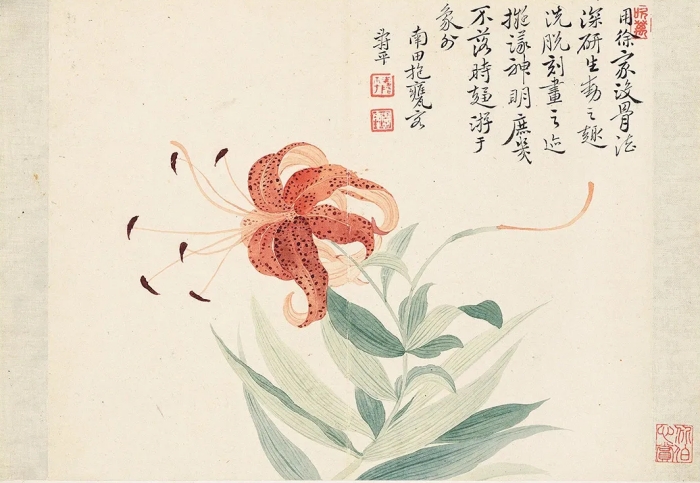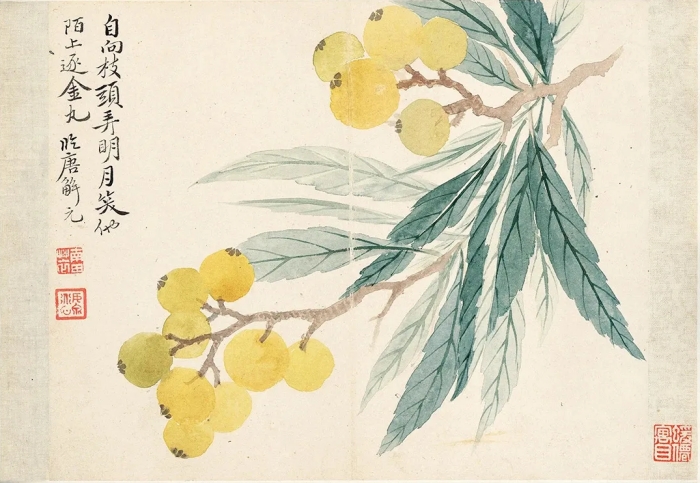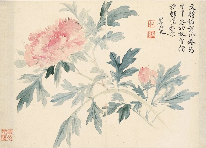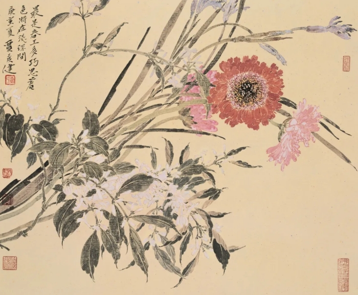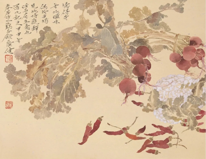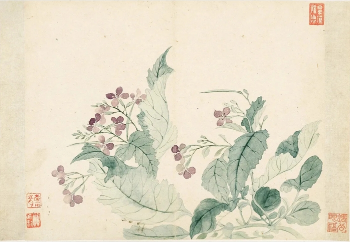 明末清初,恽寿平作为清六家之中兼善山水与花卉,而又以花卉闻名于世的唯一一人,毫无疑问可称之为宗师。天津博物馆馆藏《瓯香馆写生图》册是恽寿平晚年艺术技巧和风格纯熟阶段的作品,只用颜色点厾出花、叶、果,只以色线勾勒叶茎,形似而传神,明净清雅,韵味十足。