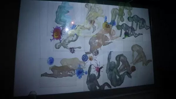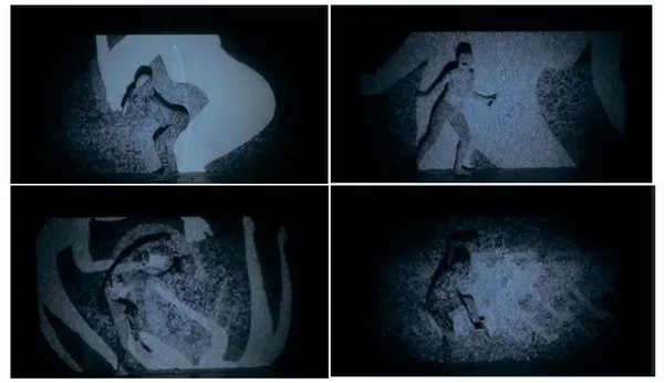沁琳将受害者形象利用丝网印刷在透明的亚克力板上,利用投影的方式将癌细胞投射出来,表现冷暴力的非直接性。动态的癌细胞通过投影的形式打在透明的亚克力板上,穿透受害者投射在后面的墙上,实体和后面的影子形成虚虚实实的关系,紧张急促的心跳声令人窒息和压抑。