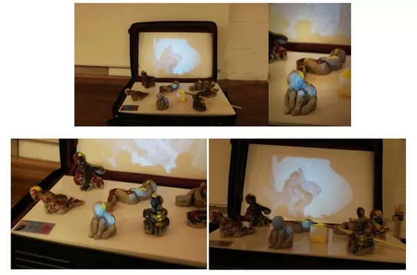 沁琳将视频中的人形实物化,做成了泥人雕塑,沁琳将这些泥人塑造成每一种情绪下的自己,将一份份情感寄托于这些泥人身上,他们面对着箱内的影像,更像是一个旁观者在观察着自己一路的经历。这是一场对个人和环境之间的联系的回望和反思。
