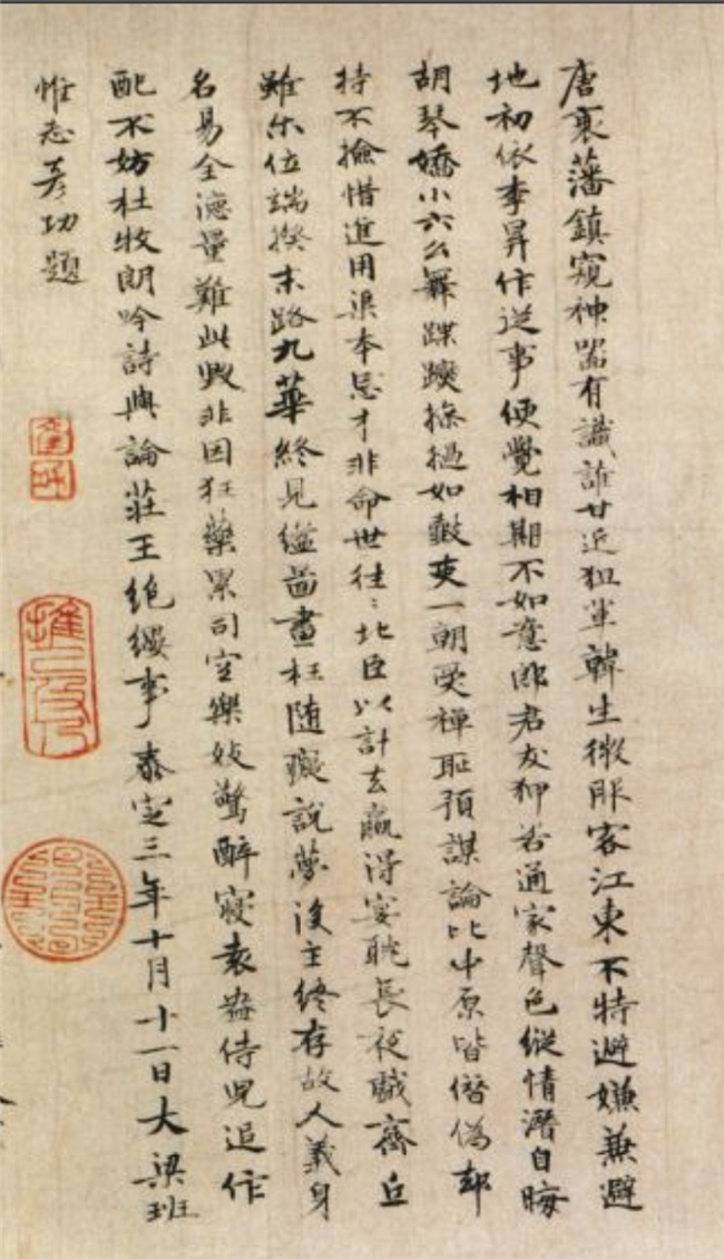 《夜宴图》奇妙地描绘了南唐时期一位备受争议的政治家举办的热闹宴会上发生的一系列事件,男男女女沉浸在享乐主义的快感中。这幅画在中国封建帝制晚期的儒家文化中受到广泛批评并不奇怪。几行书写工整而稍稍右倾的题跋表达了儒家对这幅画的正统态度。由于元代复杂的社会、政治和文化背景,这位题跋作者的身份具有微妙的争议性。他是班惟志,一位深受孔子思想熏陶的蒙古族中层官员。这八行来自泰定三年(1326年)的字背后的争议,与文化、政治因素以及个体的持久性交织在一起,值得细细分析。