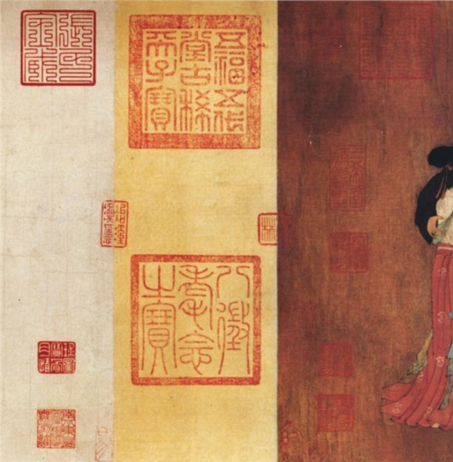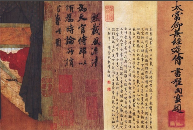 卷尾落款上的题跋为手卷提供了最多的文字装饰与框架,构成一重重“文字之屏”,保存了其在历代被接受的痕迹,发挥了艺术价值和文化传统强大的传播作用。《韩熙载夜宴图》共有49 枚印章、9个题跋和题名,使之成为艺术家与后来的受众(包括文人、画家和鉴赏家)共同创作的作品,这也揭示了与绘画相关的文化实践的微观历史。文字文献与视觉证据的对比,以一种安全无虞的形式呈现在绢帛的二维材料上,在历代流传中清晰可见。