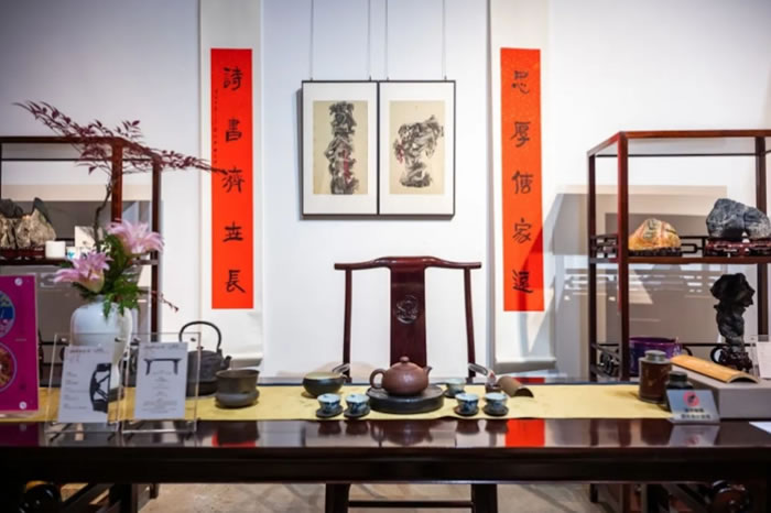 江南有名士,微妙玄通;姑苏有风物,国宝乡愁。这是一颗风雅的种子,也是这方水土的审美基因。展览现场,古董级清供国画以及名家创作的蛇年对联、蛇年生肖画、太湖石绘画等作品意境深远,笔墨精湛,吸引了众多眼球;桃花坞木板年画,一团和气实在是太应景了;清秀古雅的苏式盆景、精妙唯美的赏石摆件,或圆润如玉,或嶙峋怪异,以其独特的形态和质感,呈现着大自然的鬼斧神工与人文情怀的交融;传统技艺智慧的“天工苏作”红木家具巧夺天工,线形刚中有柔,直中有曲,简洁流畅,富有弹性和韵味;家具上还摆有古典插花,插花师以独特审美,巧妙融合鲜花、枯枝、绿叶与果实,展现了清新脱俗的插花艺术,体现了“天人合一”的哲学思想。
