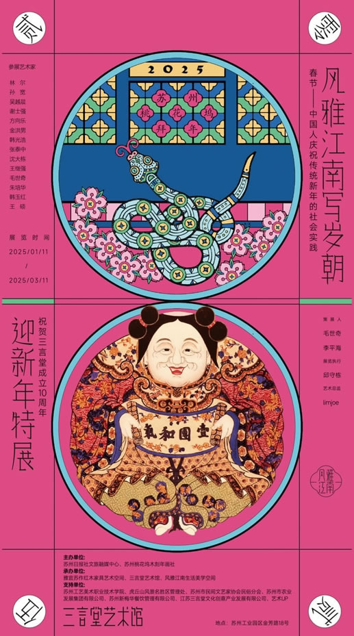 寻找家乡年,体验文化味,再现民俗乐、喜迎“酥”式年。为庆祝中国春节入选人类非遗,2025年1月11日,三言堂独家策划《风雅江南写岁朝》——迎新年特展在三言堂艺术馆(风雅江南生活美学空间)开幕。这场汇聚了传统文化精髓与现代审美创新的展览,不仅是一次视觉与心灵的盛宴,更是对江南文化、吴文化的深情致敬与传承。