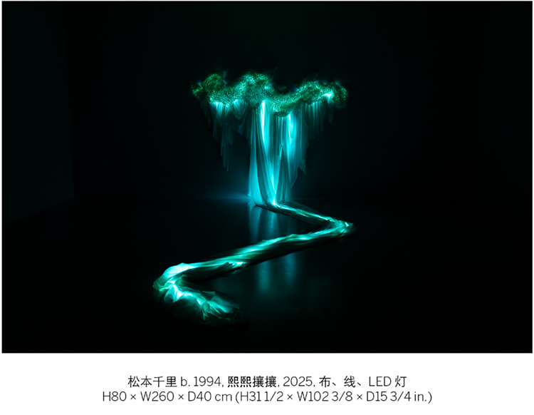 在《星空之外》(2021–2025)中,起伏的织物构建出⼀个庞⼤的星座,使观众置⾝其中,感受既是个体⼜是整体的⼀部分的奇妙体验。《熙熙攘攘》(2025)受上海河流网络的启发,展现了都市不断变化的能量,其中流动的蓝⾊光线象征着⽣命的律动。《宇宙⼤爆炸》(2025)向外扩展,体现了星系的形成,也隐喻了⼈类社会中个体的聚散流变。
