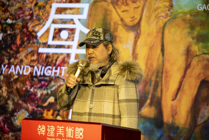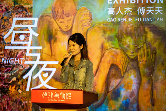 执行策展人孟令达先生在开幕式上表示,今天我们齐聚在韩建美术馆,来参加艺术家高人杰和傅天天的双个展“昼与夜”。今天同时还是节气中特别好的一个日子——雨水。因为唐代诗人杜甫曾经说过,好雨知时节,当春乃发生。我们在雨水这么一个朝气蓬勃,生机勃发的时刻聚在一起,来到韩建美术馆,其实是一件很美妙的事情,昼与夜的展览筹备过程特别顺利,从立项目的时候我们来到这儿看场地,韩建美术馆在北京西南,高人杰、傅天天他们在北京的最东边——宋庄,等于一东一西,也是很好的一个东西结合,整个展览方向、思路、布展,从灯光到位置很快就定下来了。因为这个团队非常专业,过程其实很快。希望通过这个展览给大家带来一种穿越感、穿越时间、穿越空间,去感受不同的风格,包括昼与夜的交织,每个人的内心与外在之间的互相的感受。