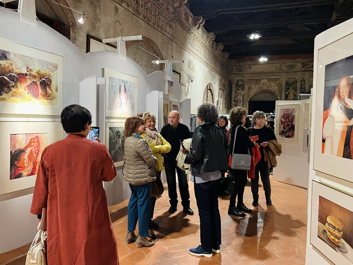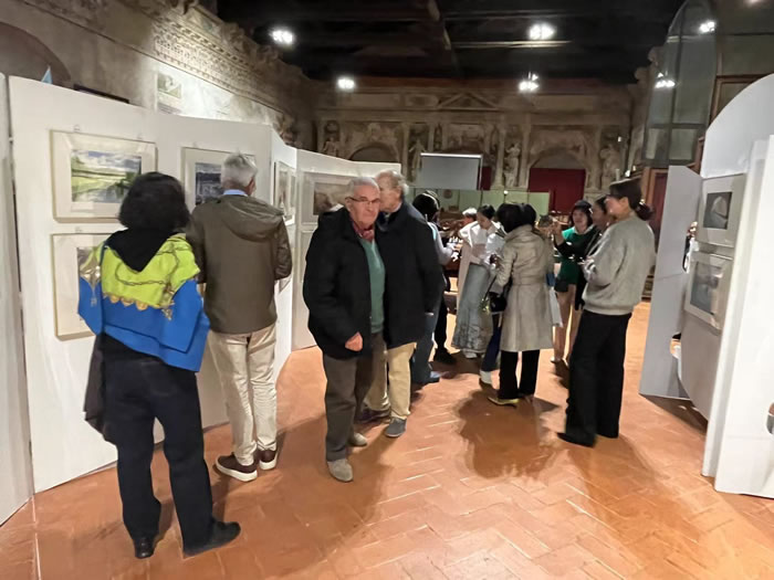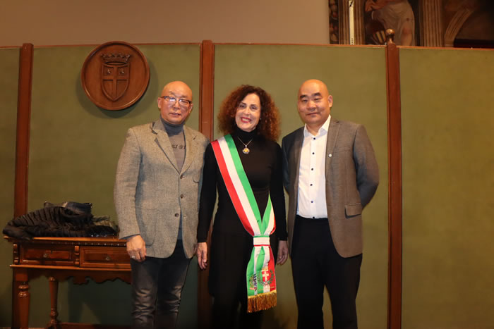 威尼斯国际水彩节策展人张鸿宾、组委会秘书长季英伦与特雷维索市文化部长在开幕式上