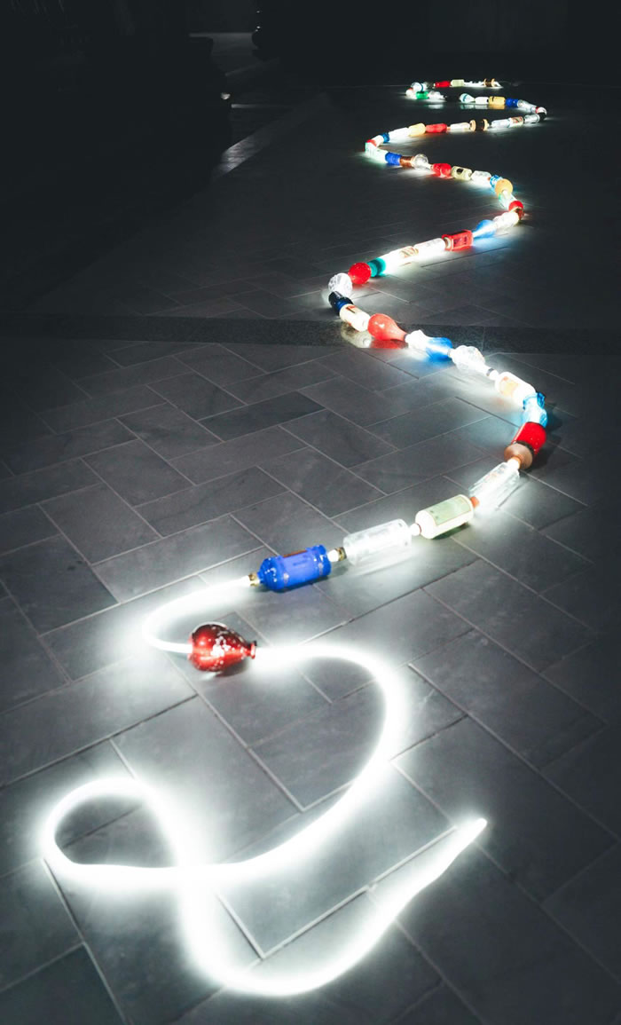 傅中望-《乙巳蛇年》,尺寸可变,酒瓶、LED,2025年