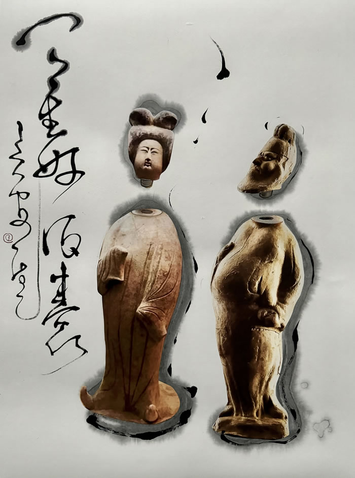 侯拙吾-《天生好酒囊(以唐俑改造的酒瓶设计)》,76x56cm,综合材料,2025年