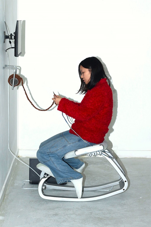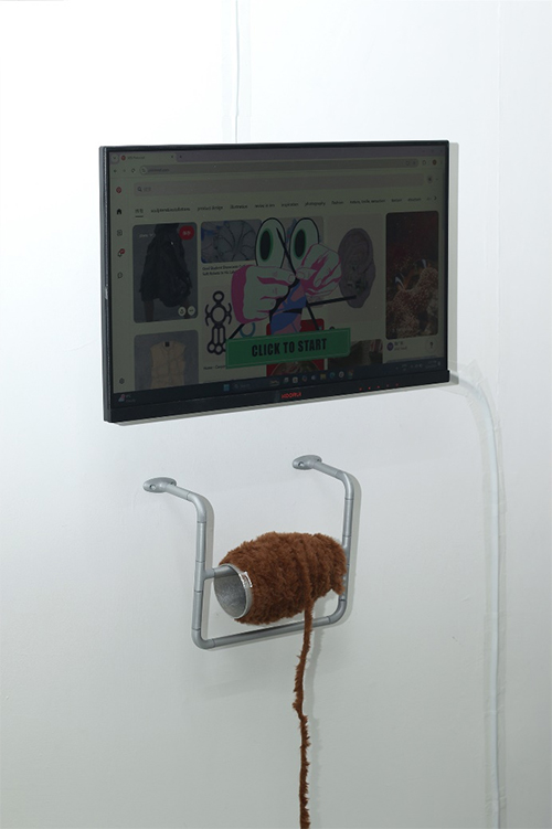 云璘的探索并不止于画布。多媒介互动的创作方式使她开始在装置艺术中寻找新的表达方式。在交互装置 《心流》 中,她将棒针改造成新型鼠标,使针织的动作与网页滚动形成同步,让屏幕浏览变得可触可感。这件作品将手工制作与数字技术融合,用传统手工将滑动屏幕的无意识行为实体化,让观众亲身感受到时间和注意力如何在推荐算法中被解构、被消费。艺术的魅力在于打破常规,它是最适合畅想人与科技可能性的场域。云璘通过作品与观众的互动,期待听到更多人在数字时代独特的经历与批判 - 科技如何影响了每个人?