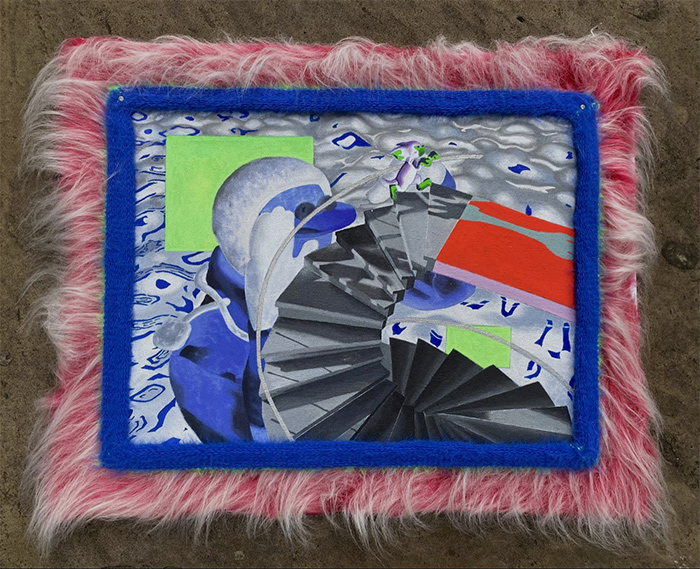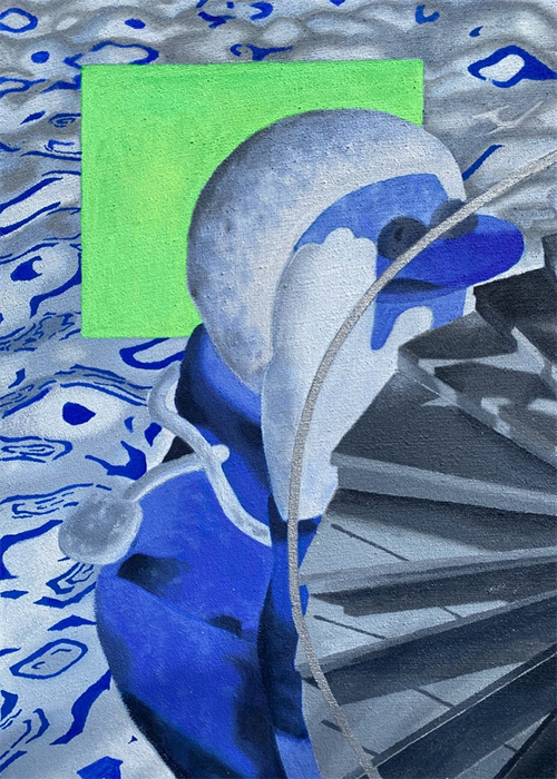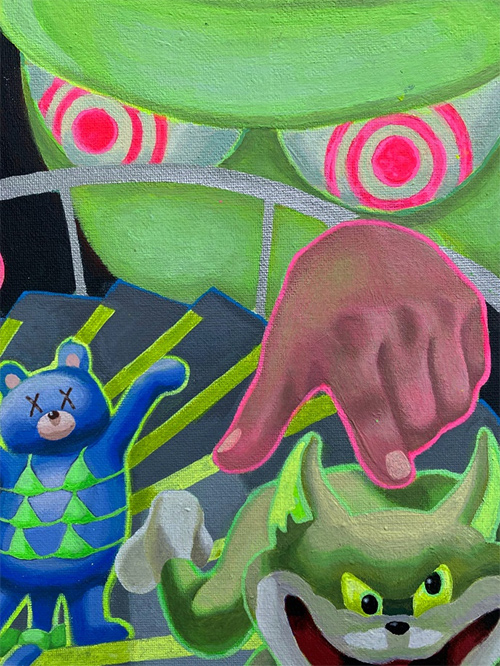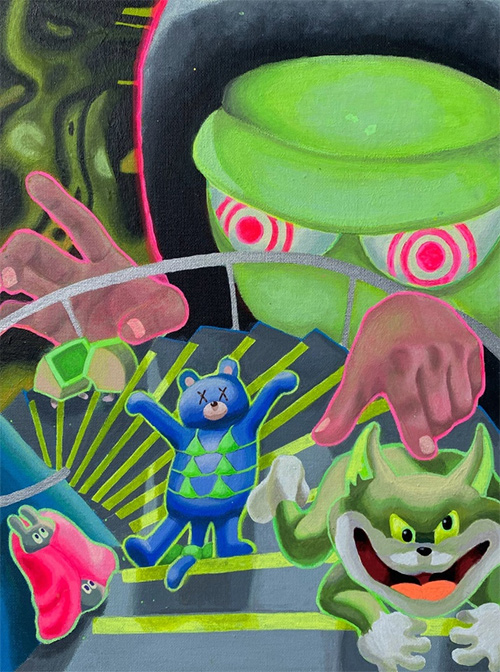 云璘视画布为一台键盘闪着霓虹灯的游戏笔记本,屏幕里跳跃着千禧年的卡通幽灵。云璘的作品展现了“数字移民”的精神世界,现实与虚拟交织,既沉醉狂欢,又焦虑不安,回应着科技进步对个体生命体验的冲击。