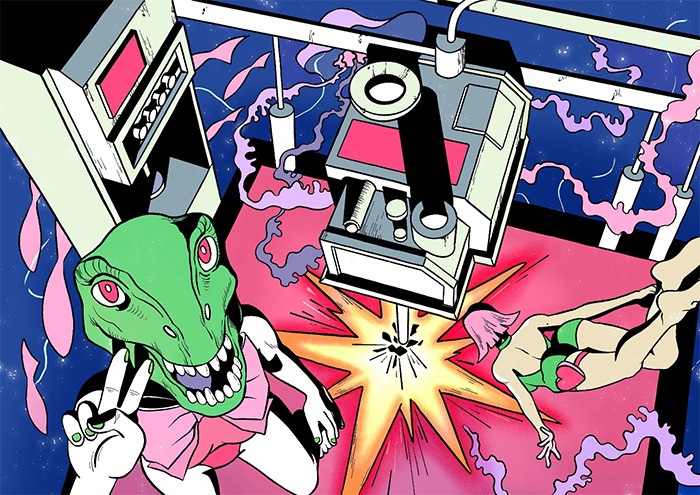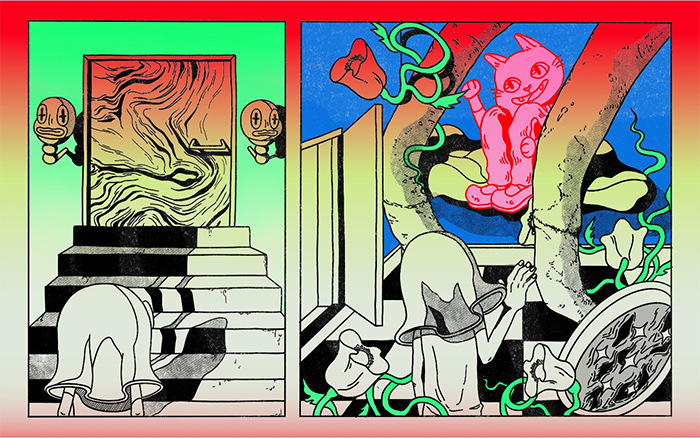 云璘运用强烈的对比色和荧光色制造出不安的气氛,使画面充满电子屏幕的光感。她的笔触细腻,尤其是在角色的光影、边缘轮廓的处理上,呈现出一种介于手绘和3D建模之间的质感,完成了模拟时代的2d卡通形象在数字环境中的变异—— 它们已不再属于曾经的世界,也无法完全适应新的科技环境。