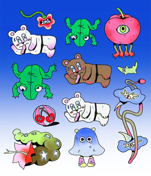 云璘的作品受童年大量接触的卡通形象影响,一边看一边把有趣的形象和场景都画在墙壁上,最后画满了三面墙。这样日复一日的积累,不仅使云璘的脑袋里有无数幻想生物的点子,更帮助她构想出一个个不被物理规则束缚的世界,这都深深影响了她的艺术风格。