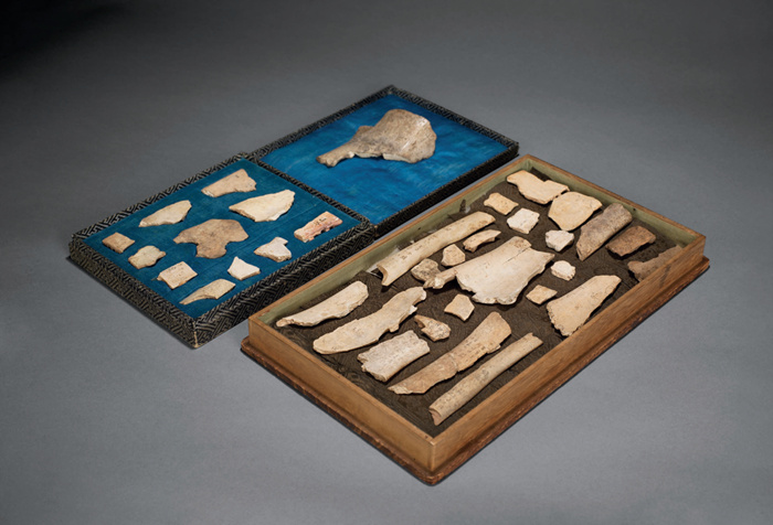商代 公元前十三至十一世纪 甲骨刻辞三十四例此批甲骨共三函、三十五件,其中牛胛骨十八片、龟甲十六片,疑似象牙质器物构件一枚尺寸不等