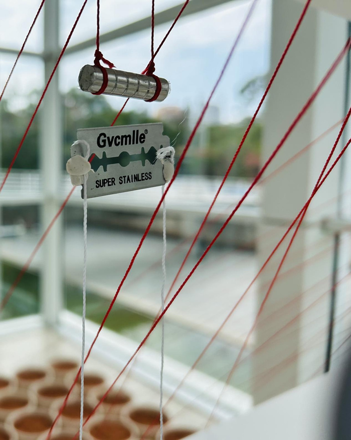 《入侵》源于艺术家作为华裔少数族群在印尼成长的个人经历,通过隐喻手法探讨地缘政治语境下的边界问题。在这件精巧的动力装置中,边界并非固定不变,而是一个经由不同主体持续协商、动态生成的场域。一根细线自装满沙子的花盆中延展而出,穿越墙洞,与墙另一侧的“风筝”相连。透过这一结构,观者得以窥见剃须刀片——它们依靠几片稀土磁铁保持直立,呈现出一种危险而脆弱的平衡。这一装置的存在本身即充满不确定性,极易因微小扰动而崩塌。