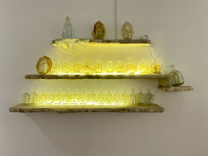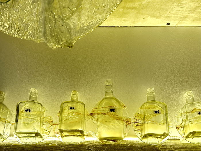 30余件瓶形雕塑——圆形、椭圆、弧形、长方形——在雪色架子上排列,破碎玻璃的裂痕化作有序的线条,在破与不破之间构筑张力。裂缝隐匿于物件间,清晰与模糊交错,使那些未曾言明的女性意识与性别隐喻得以具象化,并在流动的语境中延续。
