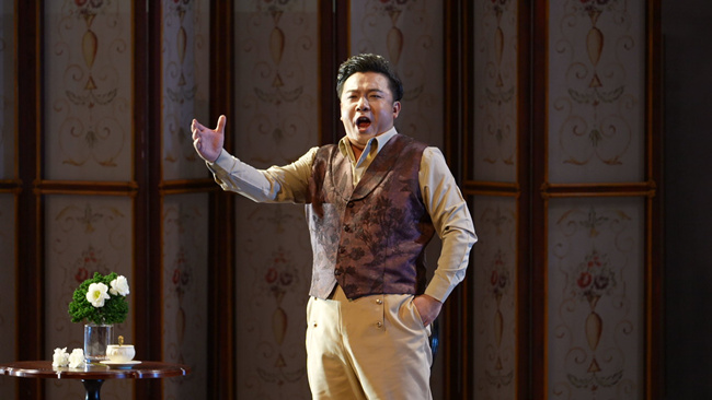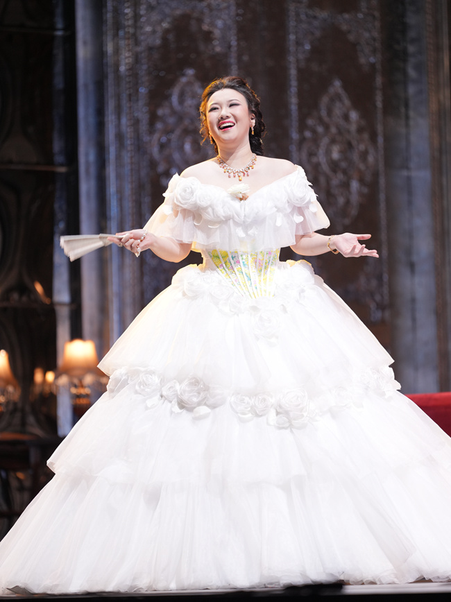 各地的舞台上涌现出无数个版本的歌剧《茶花女》,而豫版《茶花女》的舞台进行了“守正创新”的艺术创作。舞美设计以19世纪巴黎为原型,融合洛可可风格与现代多媒体技术。投影与实景道具相结合,既还原了法国贵族社会生活的奢华场景,又通过光影变幻呈现《饮酒歌》等经典场景的现代诠释,令观众身临其境。强烈的舞台表演感染力带给观众沉浸式观演体验,每一场演出都像是一场穿越时空的浪漫之旅。这部经典剧目,以"本土力量+国际水准"的模式,打造出兼具艺术深度与中原特色的舞台呈现。