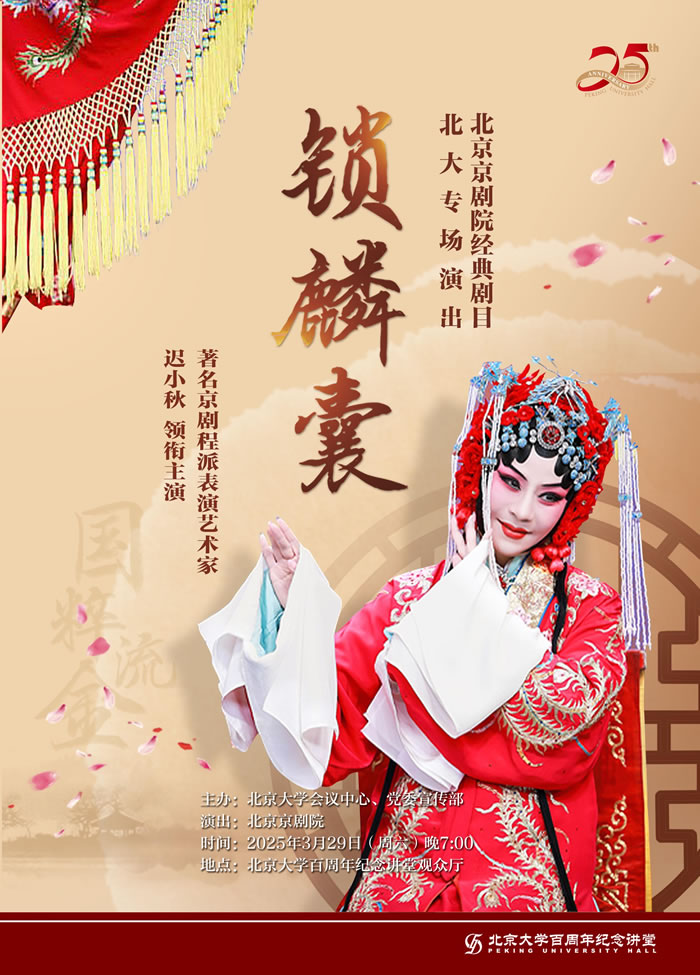 3月29日,作为“讲堂25周年系列活动”的重要内容之一,由著名京剧程派表演艺术家迟小秋领衔主演的北京京剧院经典剧目《锁麟囊》在北京大学百周年纪念讲堂精彩上演。