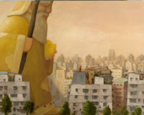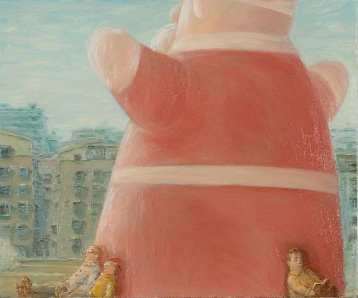 都市时代,在最初的几个系列中,他已借助于成熟的笔调呈现了恋恋风尘,为台湾省艺文界所瞩目。彼时,他是一个叙事者。艺术家颇受好评的《财神爷现身》与《熊猫来了》,以城市建筑为大背景,用民间习俗和童心意趣在现代社会里演绎全新故事,平淡中透着奇趣,引发观者无穷尽的想象。千篇一律的民房和寡淡的高架桥梁,似乎是普通生活中无数场景的缩影,自传统中走来的财神爷仍是多年来人们不变的想望,圆滚巨大的熊猫打破成人与童年的隔阂,黑白皮毛为画面带来彩色幻想。