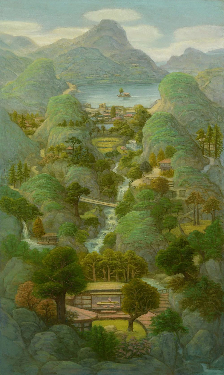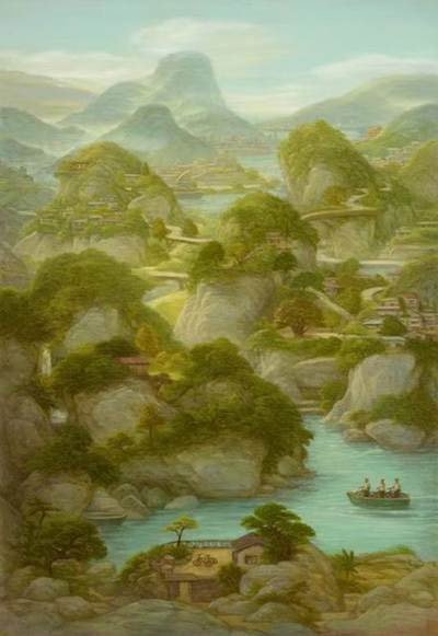 他的作品被称为“当代城市山水童话”,也是一本绿意盎然的城市松弛指南,但我们依然能从其文人笔触的绘画叙事里,隐约可辨识出中国传统立轴山水的结构。他的作品描绘绿意盎然的明媚景致,笔下的山林便成为个人心灵得以休憩、遥想的安适园地。在画中透过有距离的描绘、隐约的雾蒙,给予观者仿若自脑海里搜寻回忆一般,若即若离的视觉体验,绮丽的景致也在这层薄雾后招手,邀请观者进入其中畅想神游。