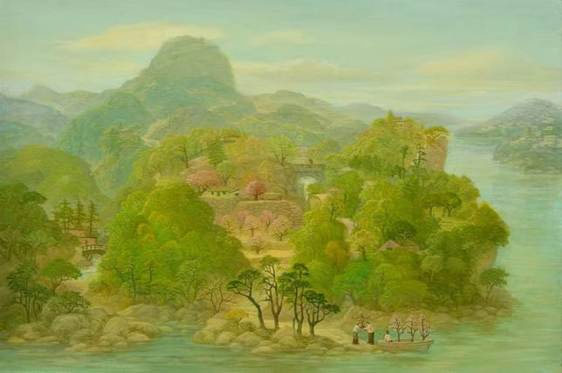 《茶花相送》以油画技法晕染带有中国山水画意境的景致,“折枝送别”是文人墨客抒发胸臆的常见题材,或是难舍故交,或是砥砺互勉,千思万绪尽在不言中。