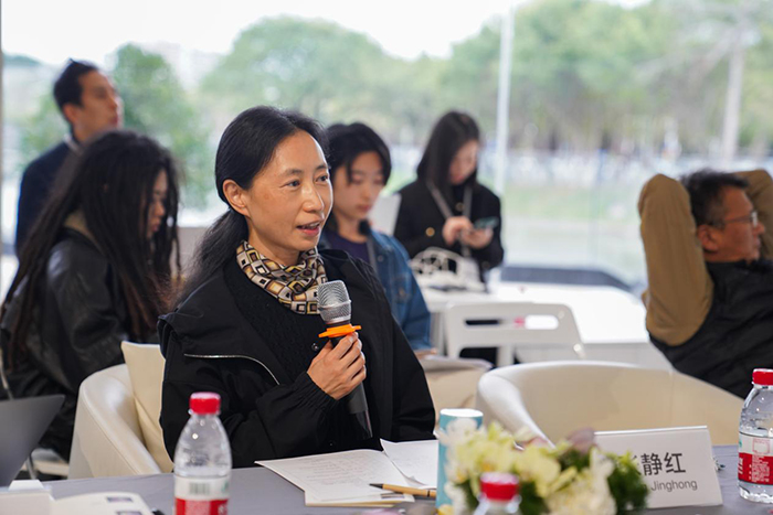 广州美术学院美术馆常务副馆长陈晓阳在总结发言中回顾了下半场论坛中嘉宾的讨论要点,强调了学科交叉与概念交织的重要性。陈晓阳还介绍了广州美术学院在教学改革中的尝试,包括实地调研方法的引入和跨学科课程的探索。她提到学校正在尝试将美术学科内部的专业打通,以应对人工智能时代的挑战,并强调视觉表达需要超越传统的象征手法,深入理解景象背后的社会结构。她呼吁在不同知识领域的碰撞中寻找新可能性,以视觉表达揭示社会现象的本质。