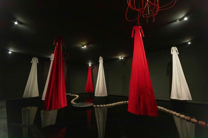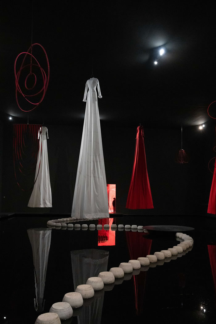 作品《多重现实》营造出极具张力的“剧场感”。在昏暗的展厅里,七件巨大而空荡的衣裙缓缓旋转,倒映在平静而漆黑的水面上。在此,艺术家以空荡的连衣裙为载体,既是对“第二层皮肤”的隐喻,亦是 对“肉身消逝后灵魂起舞”的追问——肉身虽消失,但仍能从裙摆的运动中感受到其曾经的存在。艺术家坦言:“衣服承载个体的记忆、情感与经历,是自我的延伸。”“事物的缺席并非消亡,而是融入更辽阔的宇宙,重新参与时间的流转,与万物相连。”俯瞰脚下,水面上一条蜿蜒的石墩小径连通着两个独立的空间,一端经过黑暗的甬道通向柔光充盈的《意识的蜕变》,另一端则恍惚间晕染出一片红色绳海,仿佛施了魔咒一样“引诱”观众“通往静寂之门”。