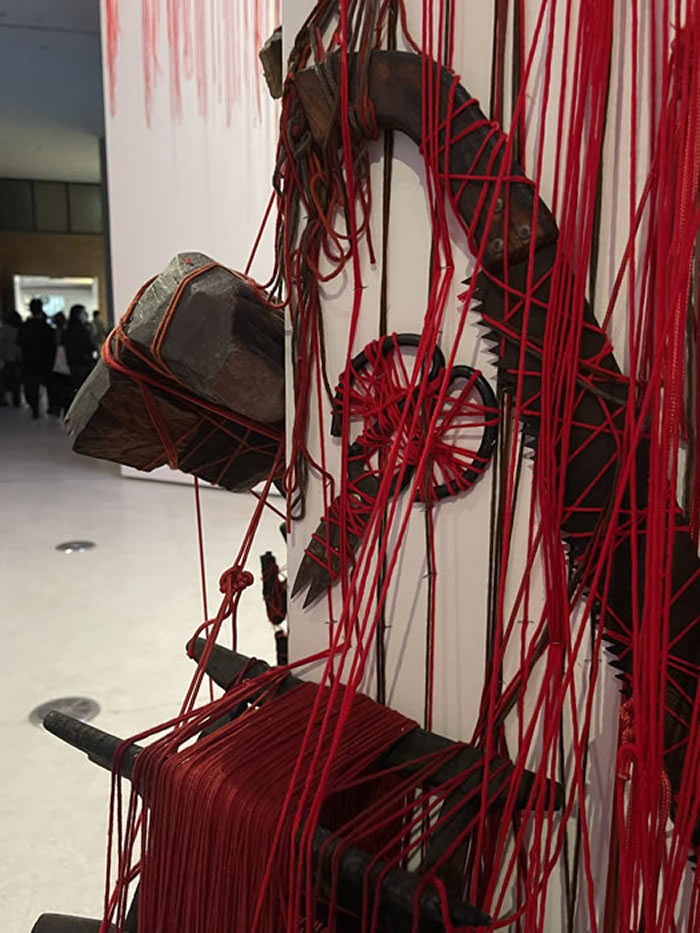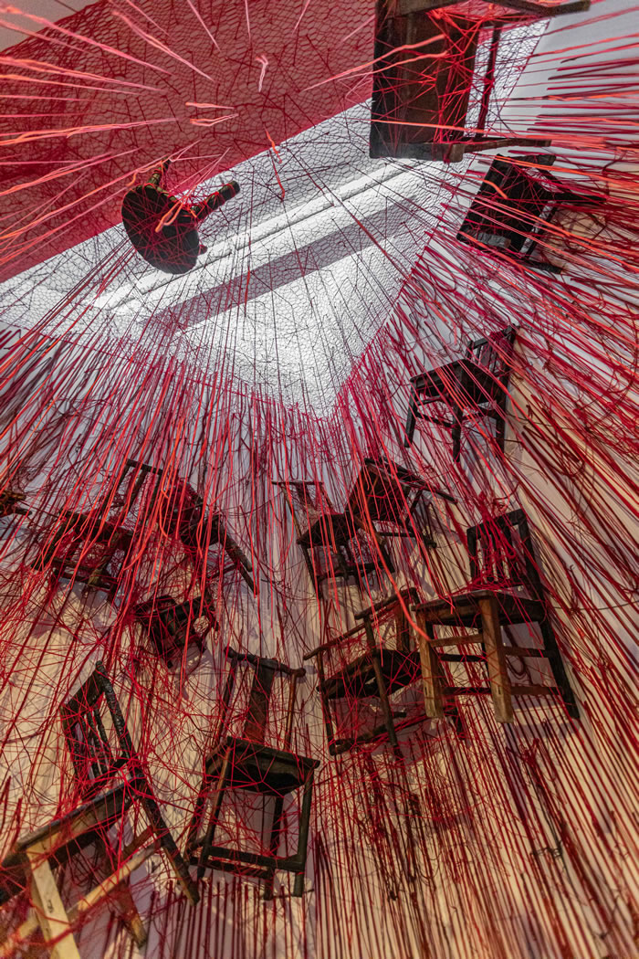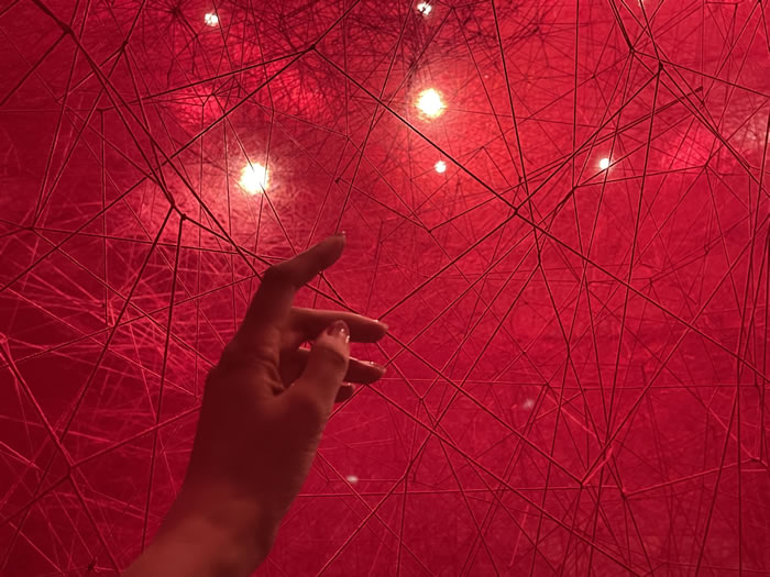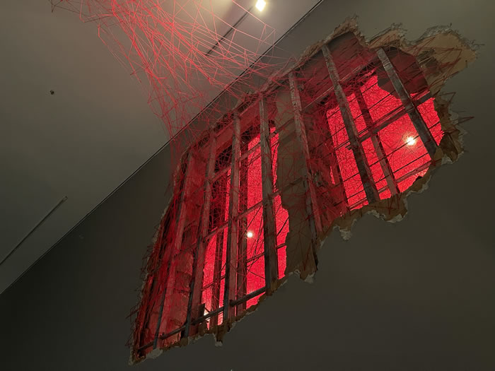 盐田千春的红绳,如同人体内的一条条毛细血管,蔓延交错,细密着将整个展厅染出一片红光。当这些红绳缠绕着夺墙而出时,又像极了人性本身——伸张向渴望的宇宙,全力冲破边界又在这一过程中彼此交织而束缚。