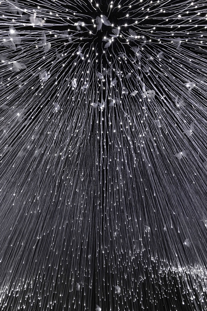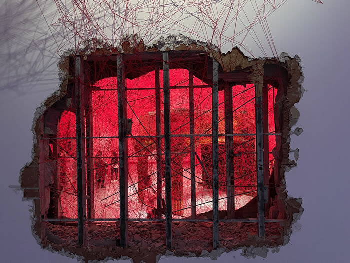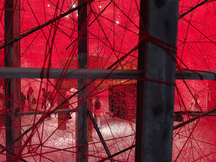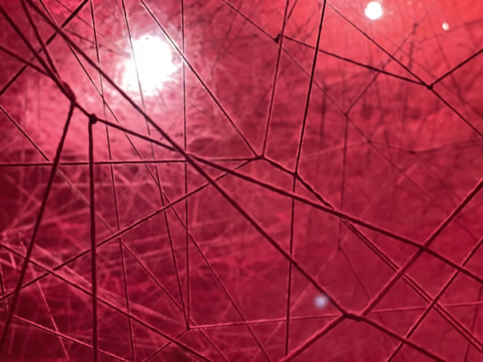 红色线绳如同毛细血管一样交织成一片海,在灯光下弥散出红色的氤氲光芒(拍摄:傅朗)