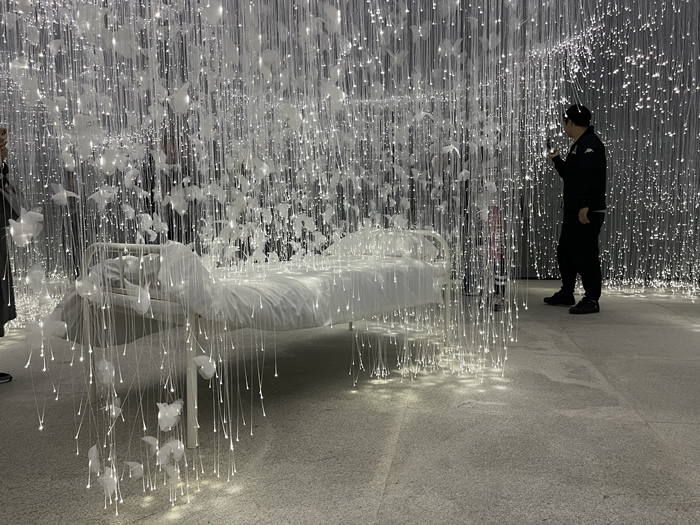 《意识的蜕变》呼应着“庄周梦蝶”的哲思。通过悬瓜的蝶翼与残留体温的床铺,挑战“肉身-意识”的二元对立。艺术家坦言:“每一次入睡都是死亡的预演——一次超越身体的旅程。”在这里,“空”恰似生死界限的消融。而在这一片如梦似幻的晶莹天地间,梦蝶-化蝶,是否也为每位观者在美好却脆弱的幻象中营造出一次“意识蜕变”的内观契机呢?