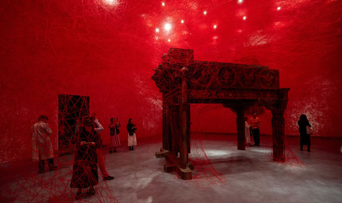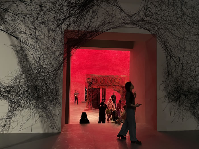 《通往静寂之门》以藏传佛教古建门庭为核心,数万根红线刺穿墙体延伸天际,形成物理空间与精神维度的双重突破。当观者穿越这座"门庭"时,传统古建的构件与当代装置语言碰撞出东方"空"的时空观——存在即是在穿透与弥合中永恒流动。本次展览策展人闫士杰认为:“盐田千春的红线在此是依缘而显、随缘应物的当下觉知。”而这件作品也邀请观者进入一个沉思与悟化的空间,凝视与自渡。