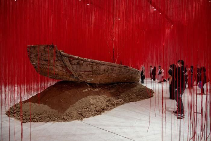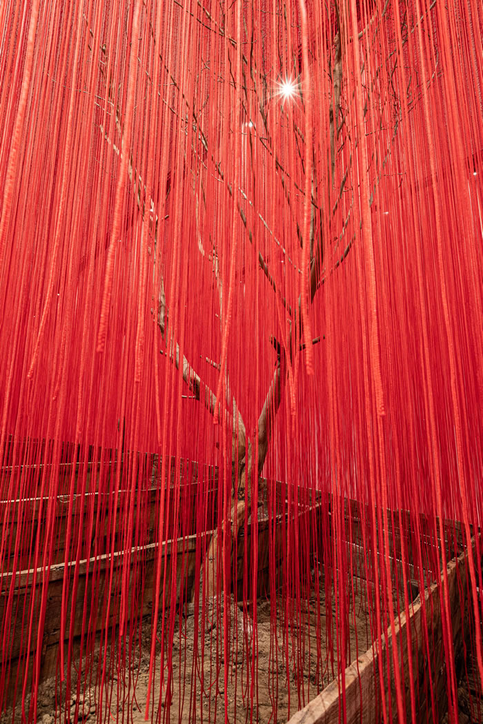 《生根的记忆》中,一艘来自河北邢台朱庄水库的废弃木船占据核心空间,船体裂缝中生长出一棵树,红色绳索如雨丝般垂落,滋养根系。盐田千春通过“树从船中生”的意象,构建自然与人类活动的共生循环:树是船的起源,船又是树的摇篮,孕育出新的生命——物质的消亡恰是生命轮回的起点,亘古绵长中,此消彼长的循环转换将无数个短暂的瞬间链接成了永恒。