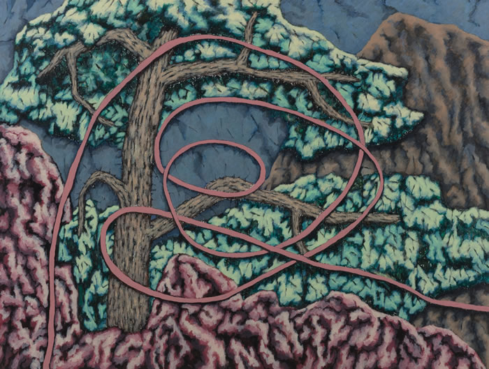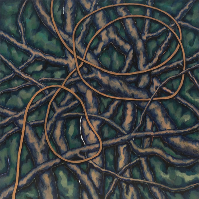 李满金作品中的空间感也在十几年的创作过程中逐步嬗变。以“丛林”系列中穿插的绳索为代表,绳索在实际的景物与观者的视觉之间开辟出另外一层空间。这是很妙的一种处理方式,因为有了这层空间,艺术家不再是直接描绘眼之所见的物象,她可以向记忆深处寻找与她有着更深情感链接的事与物;亦可使用更广泛的绘画语言。对于观者来说,观看李满金的作品也有了缓冲地带,观者有空间与时间调动自身回忆与艺术家的作品有更深链接。绳索背后的、纠缠着的、穿插着的树枝退到了下一层的空间中,它们即使相互纠缠依然具有整体性,有条不紊。然而李满金的这种处理方式却来源于一次偶然性的被破坏,她发现幼子在她的手稿本上乱画,愤怒与焦躁之余,却发现了另外一种画面塑造中的空间表达的可能性。“丛林”系列更像是一种隐喻,画面之后仿佛是艺术家生活的纷杂,而这种有条不紊的杂乱正是她创作的源泉。生命的馈赠往往令人感叹。