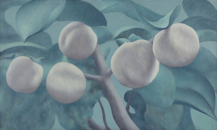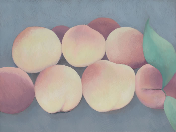 梁:我非常喜欢你最近一个系列的作品,“果实”系列。果实的指向性并不强,很难辨认出是桃子还是杏子——我想这也不是你要强调的。它的塑造的感觉更加强烈了,用小笔层层描绘,不同于以往的水性感的薄,画面效果敦厚扎实。“果实”系列的边缘也并不留白,构图与色调格外和谐。也是在这个系列中看到了你不同以往的色彩感。
