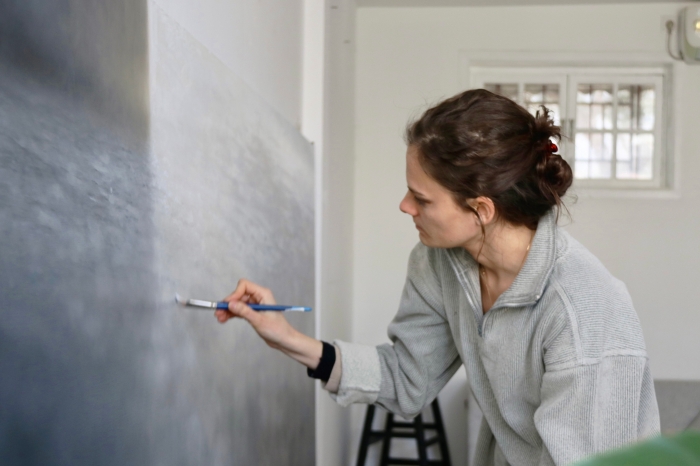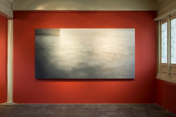 春天的第一支花、巍峨的宫墙,以及胡同住所里原色的木质屋梁,都成了白然的灵感来源。在北京,白然延续着她关于建筑门窗的研究,在法国便开始的“门槛”系列融入了新的元素。展览现场,三米长的大尺幅布面油画《方庭之窗1》尤为吸引眼球,在画面左上角,一堵墙终止于此,光线随之洒落在地面之上。14幅《方庭之窗》系列绘画当中,白然融入了她在北京漫步时走过的路面:通往景山公园山顶的台阶、故宫里数百万游客踏过的石头,以及她居住的胡同入口的地面。