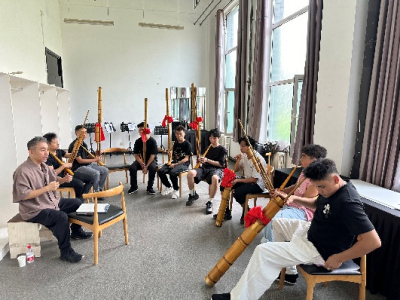 《澳门2049》中《苗歌·空灵》单元,音乐总监吴彤(左一)带领演员进行排练