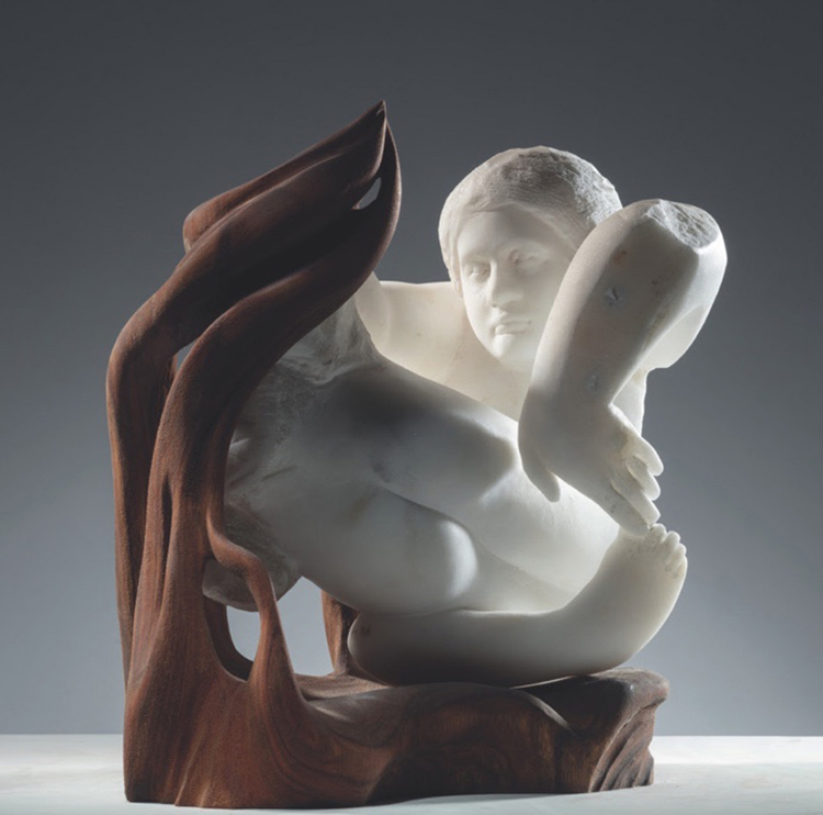展览对材料的选择具有双重象征意义。香港的再生木材源自1918年台风后城市清理的残存树木,其纹理中凝结着自然灾害的创伤记忆与生态再生的时间痕迹;意大利卡拉拉大理石则承载着文艺复兴以来的古典美学传统,象征着欧洲艺术的崇高性与永恒性。这两种材料原本分属不同的文化符号系统:一方是东亚现代城市中自然与文明的冲突见证,另一方是西方艺术史的经典介质。 然而,在《Fusion》的创作框架下,材料的文化属性被刻意悬置。策展人CynthiaSah与NicolasBertoux强调:“我们并不试图展现东西方差异,而是让材料成为中立的创作媒介。”这种去符号化策略在艺术家的实践中得到充分体现。例如,在Francesca Bernardini的大理石雕塑与Danny Lee的木质山云之间,一场关于永恒与无常、实体与虚空的东方美学对话悄然展开。Danny以斧凿之力将坚硬木材化为流动的云絮,其作品《山与流云Mountain and Streams》以嶙峋陡峭的山形扎根大地,而木质云朵却以近乎失重的姿态悬浮于侧——这组矛盾体的并置,暗合道家“负阴抱阳”的哲学:山体如《道德经》中“大制不割”的坤德,云絮则似“飘风不终朝”的易变之境。材料的物性在此被赋予形而上的张力,木质云朵的年轮肌理随光线流转,仿佛将时间坍缩为可视的呼吸。