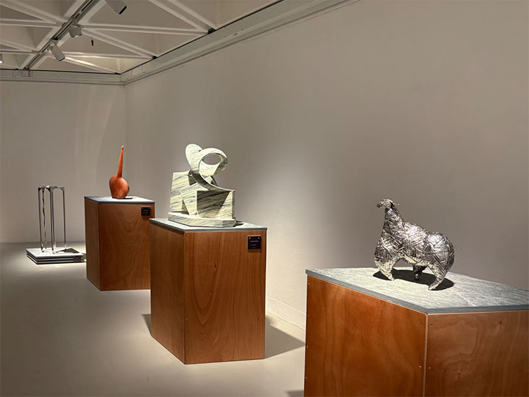 FrancescaBernardini的回应则是一场跨越物质的诗意迁徙。其大理石雕塑《Sussurrodellacollina》以意大利卡拉拉石的冷冽,雕琢出中国太湖石般的孔窍玲珑,叶状构件如被山体引力捕获的星尘,散落于基座之上。这种“以石养石”的隐喻,在《Poetry of Nature》中升华为更具建筑性的对话:雕塑中交错的枝干既似人体舒展的曲线,又如山谷回响的具象化,每一处小的支撑与被支撑的接点,皆暗藏力学与美学的精密博弈。当DannyLee的木质“小石”途经这片大理石构筑的剧场时,材料的异质性在负空间中消融——木纹的温润悄然渗入石质的理性网格,恰似云气漫过山脊时模糊了虚实边界。