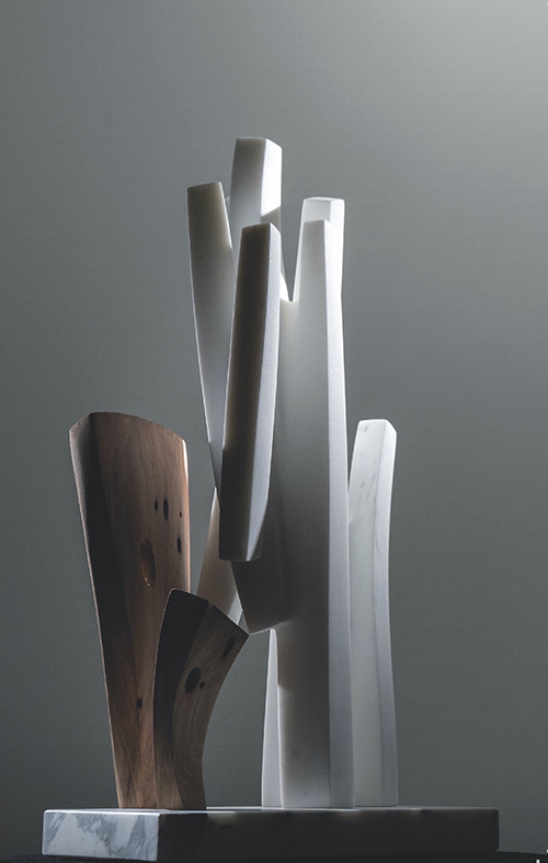 二人的创作轨迹形成螺旋上升的互文:DannyLee以云破山,FrancescaBernardini以山纳云;前者将东方水墨的“留白”转化为三维空间的气韵流动,后者则将西方雕塑的体积感解构为东方赏石的“透漏”美学。在展览的框架下,这种对话超越了简单的文化符号拼贴——当FrancescaBernardini追索DannyLee雕塑中的线性节奏时,她并非在复刻东方性,而是以大理石的永恒性重述“无常”的命题;而他们构筑的石质窗棂间植入木构元素,实则是以材料的易朽性叩问存在的本质。木材与大理石的碰撞既非东方主义的异域想象,亦非西方中心的技术崇拜,而是通过物质的重构,创造出一个超越二元对立的混合美学空间。