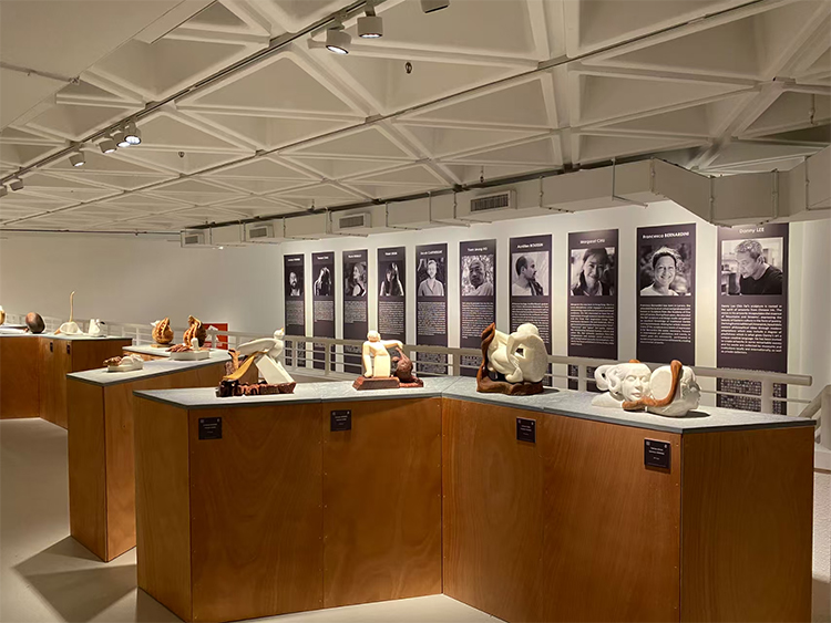 Flavia Robalo的大理石水痕与Violet Shum的木质漂流壳,在展场中交织成一部关于迁徙的液态史诗。FlaviaRobalo以意大利卡拉拉石的冷冽雕琢——少女俯身掬水的瞬间被凝固为永恒的仪式,水流从她指缝渗入石纹,仿佛将地中海的盐分注入东方水墨的留白。而Violet Shum的木质装置《When we met》则以螺的拓扑学重构故土:那些起伏如四拍子节奏的曲面,既是潮汐冲刷的数学显影,亦是香港离散者精神图谱的物化。当大理石中的“水”与木质“壳”在空间中并置,材料的对抗性悄然消解——水的重力被壳的浮力中和,恰似流散者以轻盈姿态承载乡愁的重量。